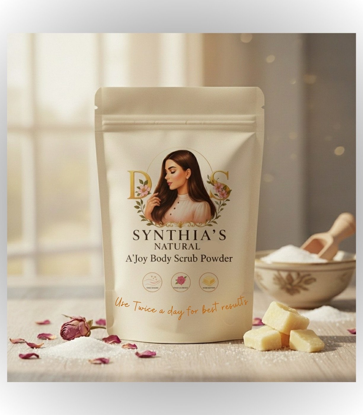 Upgrade your skincare routine with Synthia’s Natural – A’Joy Body Scrub. It’s not just a product—it’s a promise for naturally nourished, visibly revitalized skin.